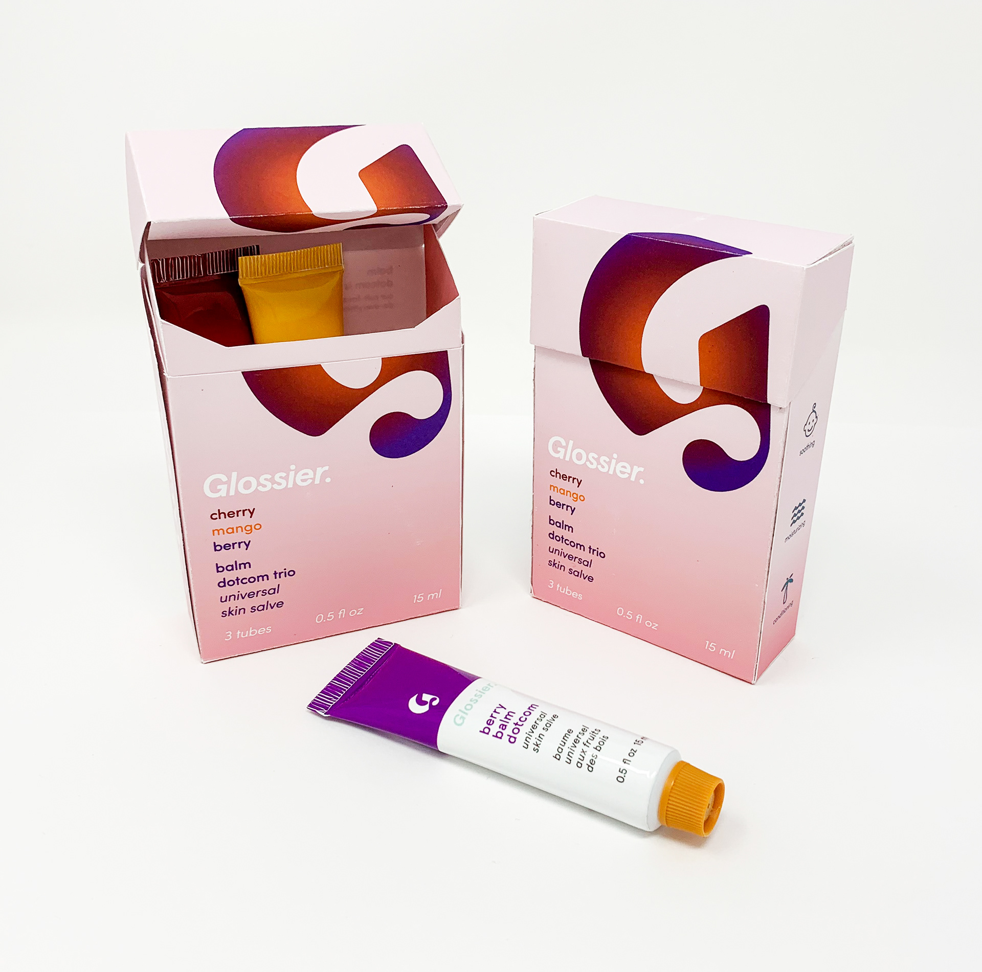 • Glossier is known for minimalistic design • Set is sold online, but each balm comes individually packaged • Novelty design packages all 3 in one carton • Reference balm packaging in carton design • Utilized gradients to show dimension •